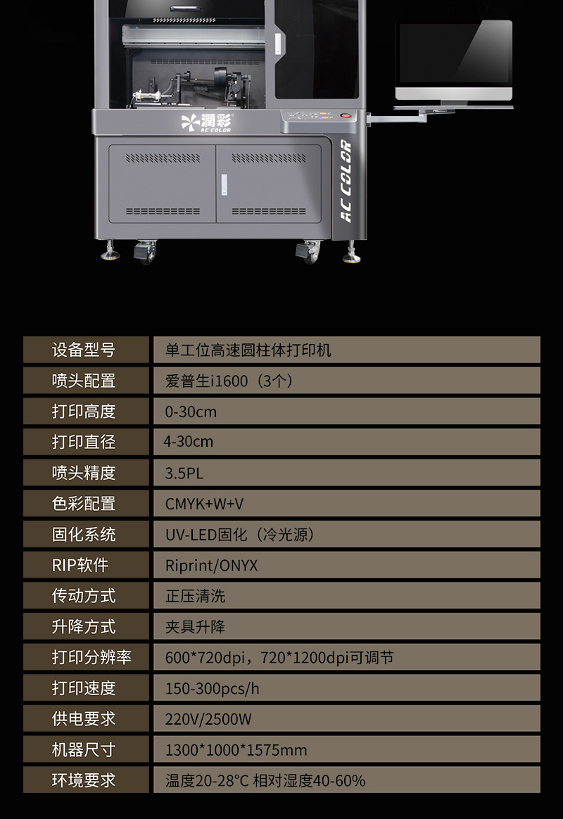 在速度各精度上都一直在进步的同时,润彩uv打印机研发团队同时也在不停地接收市场对圆柱体打印和不规则的圆锥体打印需求,于2019年研发出一款针对性的高速圆柱体打印机,此款打印机针对于一些非大批量生产,但同时也需求能非常快地生产出单个或者数量较少的成品的客户,更可支持360度无缝拼接技术,在正常的打印模式下打白彩能达到25秒印刷一个产品,如果只打白色,完全印刷出一个保温杯的时间突破20秒以内,此等技术目前在国内而言也是非常少的,对于某些有特殊需求的客户来说,360度无缝高速圆柱体打印机是一台操作简单,单个生产速度快的打印机。